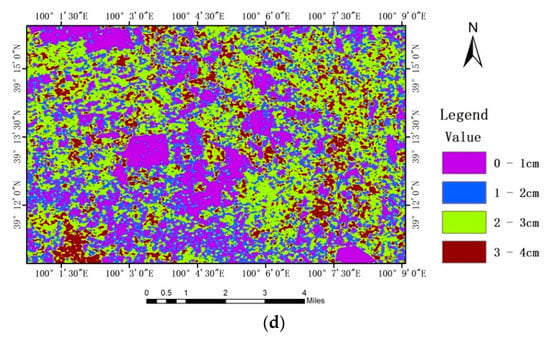 Distribution map of soil moisture mv and Hrms: (a) mv, θ = 33.5°; (b) mv, θ = 26.3°; (c) Hrms, θ = 33.5°; (d) Hrms, θ = 26.3°.