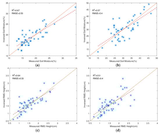 Comparison between inverted and ground-measured soil moisture and Hrms: (a) soil moisture, θ = 33.5°; (b) soil moisture, θ = 26.3°; (c) Hrms, θ = 33.5°; (d) Hrms, θ = 26.3°.