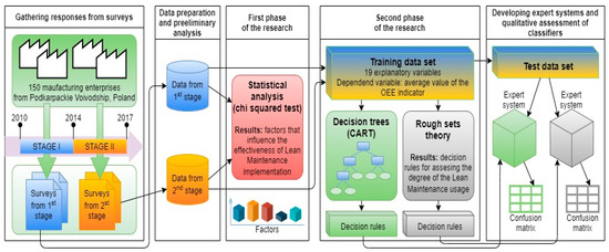 The resulting indicators for testing the quality of classifiers confirmed the high usefulness of the generated decision rules, both those using decision trees and the rough set theory. The developed dependencies allow us to assess which results a given company can expect after the implementation of specific lean maintenance methods and tools, and which lean maintenance methods and tools should be used to achieve the intended goals. These dependencies may be the basis for determining the directions and effects of implementing lean maintenance in manufacturing companies. Additionally, an expert system in the form of a software application, developed on the basis of the generated dependencies (decision rules), allows for the selection of appropriate actions in order to obtain the best results after implementing lean maintenance.