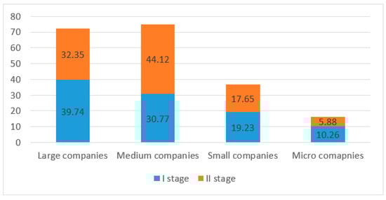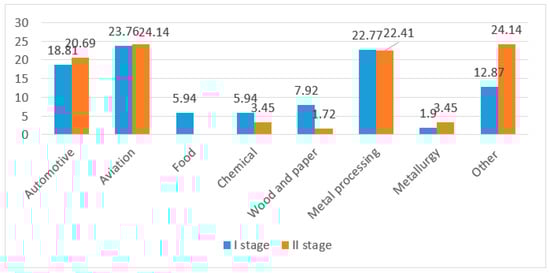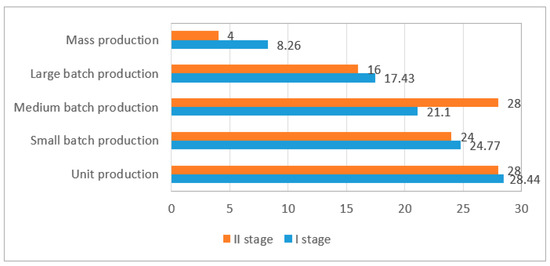Unit production dominated among the surveyed enterprises (stage I: 28.44%, stage II: 28%) and low- and medium-batch production, respectively, (stage I: 24.77%, stage II: 24%) and (stage I: 21.10%, stage II: 28%) (Figure 4).