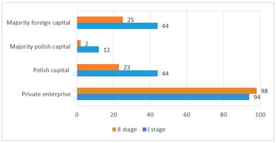 The aim of the first stage of the research was to collect information on the use of lean maintenance methods and tools in enterprises, such as total productive maintenance (TPM), single minute exchange of die (SMED), 5S, and OEE indicator. The research, which was carried out in two stages, stage I—in 2010–2014 and stage II in 2014–2017, covered 150 production companies in the Podkarpackie Voivodship. The following criteria were taken into account when classifying the surveyed enterprises: size of the organization, production, type, industry, type of ownership, its capital, the company’s condition, and the type of machines owned. Among the analyzed enterprises, there were those that carried out several types of production or operated in several industries. Among the analyzed enterprises, the biggest group were large enterprises (stage I: 46%, stage II: 52%). The next group were medium-sized enterprises (stage I: 27%, stage II: 32%). Among the surveyed enterprises, those from the metal processing industry dominated (stage I: 22.77%, stage II: 22.41%), followed by the aviation industry (stage I: 23.76%, stage II: 24.14%) and the automotive industry (stage I: 18.81%, stage II: 20.69%) (Figure 2). The majority were private enterprises (stage I: 94%, stage II: 98%) with Polish capital (stage I: 44%, stage II: 2%) or majority foreign capital (stage I: 44%, stage II: 25%) (Figure 3).