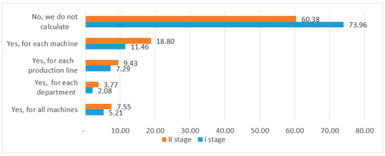 Figure 5 shows that most of the analyzed enterprises still do not apply the OEE indicator (stage II: 60.38%, stage I: 73.96%). Only a few percent of the enterprises use this indicator for all machines (stage II: 7.55%, stage I: 5.21%).