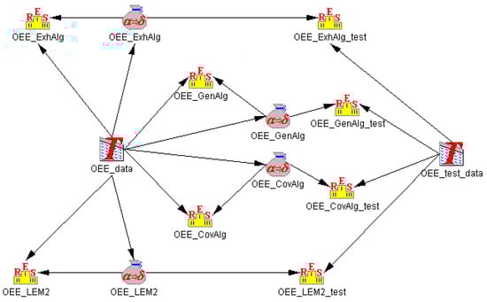 Each of the four rule sets was used for the classification of the data from the OEE decision table. The classification was accomplished by a standard voting method. The manner of such voting is as follows: each of the generated rules determines the value of a variable described for the considered object (an enterprise). The calculated match value of particular rules is treated during the voting as an importance—the higher the match of a given rule, the more important is its vote. That is why it is more influential on a final voting result than the vote of the rule with a lower match. Eventually, the object is assigned such a value of an explanatory variable that won the weighted voting.