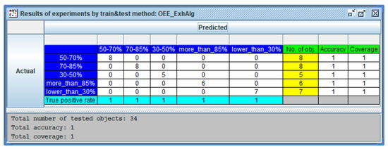 The result of the classification was presented in the form of a confusion matrix. The confusion matrix that includes the results of the classification accomplished by the rule set generated by an exhaustive algorithm was presented in Figure 8. Matrix rows correspond to the real decision classes (the values of the variable described). However, matrix columns are the results of the classification that was accomplished by the generated rules. All 34 objects that are in the decision board were classified properly. It is reflected in the values located only on the main diagonal of the confusion matrix. The last three columns in the described figure show the information on the number of objects belonging to a given decision class (no. of obj.), accuracy, and coverage. The last row of the table is the true positive rate calculated for each class individually. The bottom part of the window presents the number of all studied objects and the accuracy and coverage calculated for all decision classes altogether.
