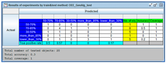 The results of the surveys from 20 companies of the Podkarpackie Voivodship were reused to validate the decision-making rules. Among the companies analyzed, the largest group included large companies (85%) from the aviation industry (50%). The majority of them were private companies (95%), with a majority of foreign capital (85%). Large-batch production (45%) dominated among the companies surveyed. On the basis of the results obtained, a decision table was created. The created decision table was introduced into the RSES system. It allowed us to create a confusion matrix for the explanatory variable “an average OEE value”. Maximum coverage calculated for all decision classes in total that equals 1 and accuracy of 0.30 for the explanatory variable “an average OEE value” were achieved using a set of rules generated by a genetic algorithm (Figure 9).