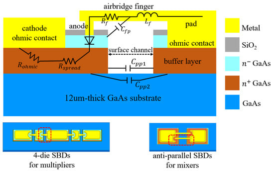 In terms of lumped equivalent circuits, a large amount of literature is available on the modeling of Schottky diodes in millimeter and submillimeter waves operating at room temperature [30,31,32,33]. For this design, a simplified equivalent circuit model was used, which is marked on the cross-sectional view in Figure 1. The Schottky junction is represented by a diode symbol, modeled as voltage-dependent junction capacitance (Cj) and resistance (Rj). The diode’s series resistance (RS) consists of airbridge finger resistance (Rf), buffer-layer spreading resistance (Rspread), ohmic-contact resistance (Rohmic), and top junction epi-layer resistance. Several parasitic elements were used to characterize parasitic coupling effects dependent of the diode geometry, where the magnetic field coupling within the airbridge finger was modeled as Lf and electric field coupling near the surface channel was modeled as Cpp1, Cpp2, and Cfp. Based on these equivalent circuit components, the electrical parameters obtained through measurements are shown in Table 1 and Table 2. The equivalent model of the diode had to be slightly different, depending on the specific application. For multipliers, nonlinear junction capacitance Cj0 played a leading role, which could be improved by properly increasing the anode junction area and reducing the doping concentration of the epitaxial layer. However, mixers were more dependent on the nonlinear resistance characteristics of the diode junction because broadband impedance matching was easier to achieve when nonlinear resistance dominated. Additionally, the HFSS 3D model of the diode is presented at the bottom of Figure 1, including anti-series 4-die SBDs for 0.34 THz triplers and anti-parallel SBDs for 0.34 THz SHMs.