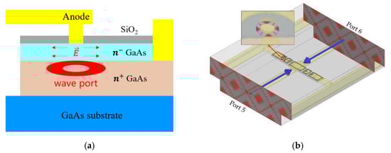 Schematic diagram of (a) wave port configuration of diode anode junction and (b) setup for high-frequency 3D EM simulations.
