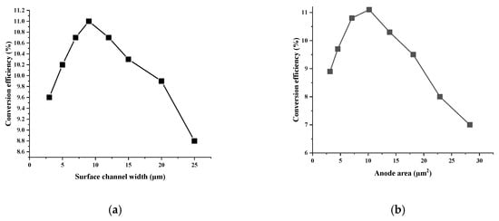 Simulated optimum conversion efficiency with (a) different surface channel widths and (b) different anode junction areas.