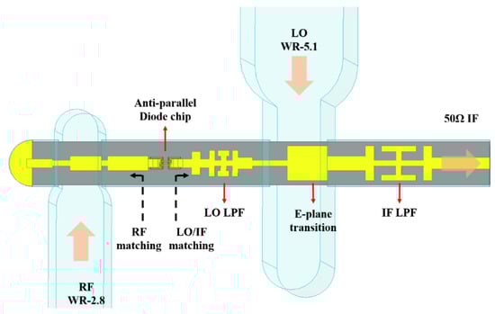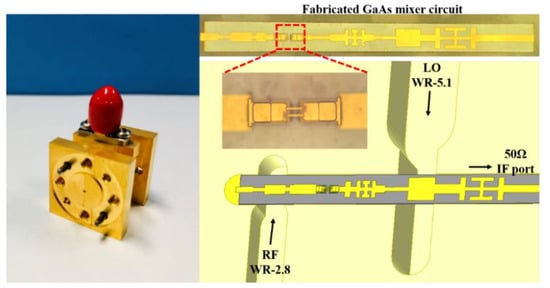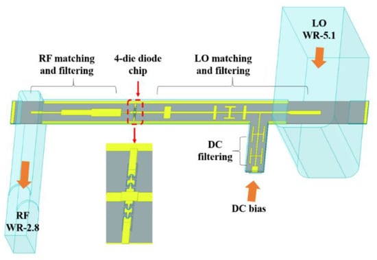 - Chen, Z.; Zhang, B.; Fan, Y.; Yuan, Y. Design of a low noise 190–240 GHz subharmonic mixer based on 3D geometric modeling of Schottky diodes and CAD load-pull techniques. Ice Electron. Express 2016, 13, 20160604. [Google Scholar] [CrossRef]