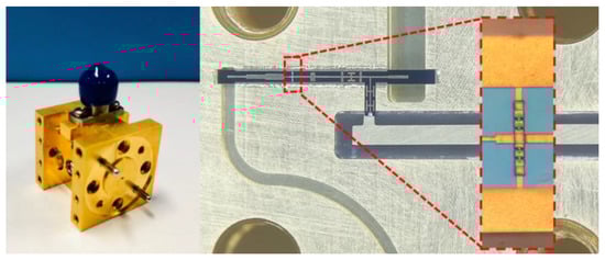 A photograph of the fabricated THz GaAs monolithic integrated tripler circuit within a split block is shown in Figure 5. As can be seen, the 4-die SBDs were integrated with the matching circuits, and the whole tripler circuit was fixed on the block through the beam lead. Due to the large relative dielectric constant of gallium arsenide, it was impractical to connect the tiny DC feeder circuit directly to the external subminiature version A (SMA) connector. Therefore, the transition circuit on Rogers RT/duroid 5880 was fabricated and connected to the GaAs circuit through silver glue. The zoomed view of the diode chip was given as proof that the monolithic integrated diode technology eliminated the manual assembly errors that may have been introduced by the flip-chip mounting of discrete diode chips. Simulation results show that the output power of the tripler was more than 3.6 mW in the frequency range of 324~352 GHz and reached the peak efficiency of 10.7% at 340 GHz under the condition that input power was 100 mW and bias voltage for each die was −1.95 V.