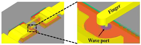 The schematic diagram of the wave port configuration of the diode anode junction and the setup for high-frequency 3D EM simulations is shown in Figure 2. Each diode’s wave port was defined as a miniature coaxial hollow ring piece surrounding the anode, as illustrated in Figure 2a. The electromagnetic field around the anode junction was calculated with HFSS. The gap between the edge of the anode and the coaxial hollow ring piece must be very narrow to avoid underestimating the parasitic capacitance [34]. The 4-die diode chip was embedded in the suspended microstrip line with both ends of the diode extended toward the two wave ports, numbered as 5 and 6, as shown in Figure 2b. The effect of the transmission line was removed by de-embedding the wave port to the diode chip. Thus, the 3D EM simulation model was set up and measured by the six wave ports. Using the obtained linear S-parameter results already considered the parasitic effects caused by the diode geometry, which is represented by the several parasitic elements in Figure 1. Harmonic balance simulation was then performed in Keysight Advanced Design System (ADS) to calculate the conversion efficiency. Finally, parametric sweep simulations were conducted for the circuit’s optimum performance under a specific channel width and anode junction area. The optimization results are shown in Figure 3a,b, from which we can see the best surface channel width of 8.5 μm and anode junction area of 10 μm2.