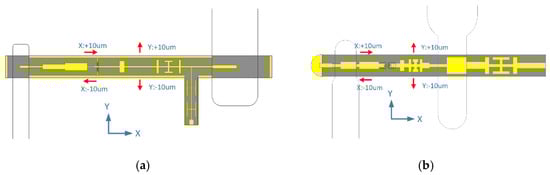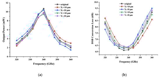 We conducted tolerance analysis through simulation to estimate the impact of possible errors on device performance. In the actual fabrication process of triplers and mixers, potential errors may occur from substrate processing, cavity machining, and circuit assembly. Among them, the semiconductor technology ensured that the substrate processing error was guaranteed within 0.5 μm, which had a negligible impact on the circuit, working at 0.34 THz. However, the tolerance of cavity machining and circuit assembly were generally about ± 5 μm, which could not be ignored and would affect the performance of devices. Since the two types of error were relative, cavity machining error could be accumulated to the circuit assembly error, that is ±10 μm. Therefore, it can be simplified to only perform tolerance analysis on the positioning deviation during substrate assembly. Taking the Cartesian coordinate system as a reference, the GaAs integrated circuit moved ±10 μm in the x and y directions, as shown in Figure 9. The tolerance analysis simulation results and comparison with original simulation data are presented in Figure 10.