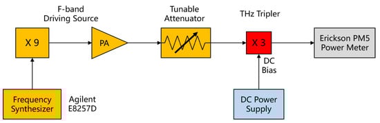 The tripler’s test diagram is shown in Figure 11, in which the frequency synthesizer Agilent E8257D provided frequency reference to the F-band driving source, which mainly featured the ×9 frequency multiplication and power amplification. A tunable attenuator was inserted between the tripler and the F-band source to easily adjust the wanted input power up to 100 mW. The Erickson PM5 waveguide power meter was used to measure the output power around 0.34 THz and calibrate the input power. When tested, the DC bias voltage was tuned to obtain the best performance within a certain frequency range.