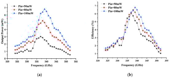 Measured (a) output power and (b) frequency conversion efficiency of the 0.34 THz tripler with different input power levels from 324 GHz to 352 GHz.
