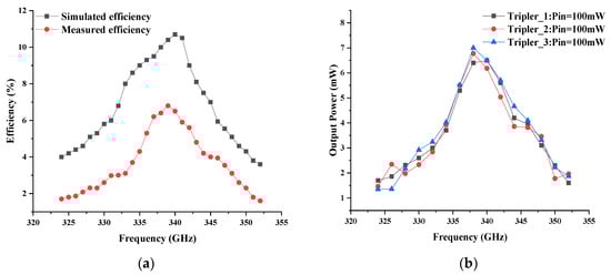 The performance of the tripler with different input power levels is depicted in Figure 12. With known input power and output power, efficiency can be calculated. As can be seen from the measurement results, a peak efficiency of 6.8% and maximum output power of 6.8 mW were obtained at 338 GHz with an input power of 100 mW and a DC bias voltage of −2.56 V. It was found that −1.28 V was the optimum bias voltage for every single Schottky die. In addition, the tripler showed greater than 1 mW output power in the range of 324 GHz−352 GHz when driven by 100 mW. From the perspective of the increasing tendency of output power with increasing input power from 50 mW to 100 mW, there was still room for further improvement in output power. It is indicated that the tripler still did not reach saturation when driven by 100 mW, which is currently already the highest available power, from 108 GHz to 117.33 GHz, in the lab. Moreover, a comparison between simulated and measured performance with 100 mW input power is given in Figure 13. Note that the measured curves had a similar trend to the simulated curves, though the measured conversion efficiency was a little lower. The frequency corresponding to the measured peak efficiency was close to the simulated frequency, implying the effectiveness of the diode design method and accuracy of performance prediction based on simulations in this work. Moreover, the measured results of the three triplers at room temperature are shown in Figure 13b. Note also that the three different triplers had very similar performance in terms of efficiency and bandwidth. This implies that the monolithic integration process proposed in this article is reliable and can ensure consistency between different products.