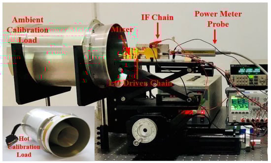 Photograph of the 0.34 THz SHM’s noise temperature test platform using Y-factor method measurement. The ambient/hot calibration load, respectively, radiates broadband noise energy related to real-time temperature into the receiver through feed horn antenna. Every time the calibration load is exchanged the under-test receiver is position fixed.