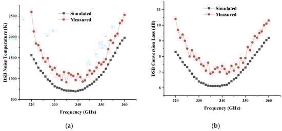 Simulated and measured performances of 0.34 THz SHM from 320 GHz to 360 GHz (a) double sideband (DSB) noise temperature and (b) DSB conversion loss.