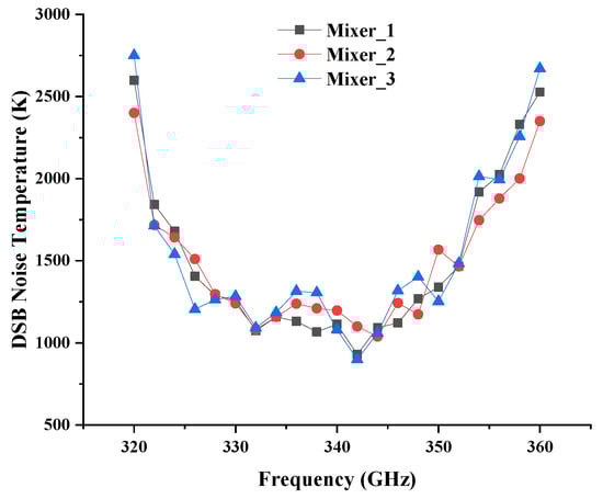 The DSB noise temperature and conversion gain of the receiver (including the SHM and IF chain) can be calculated through Y-factor measurement. Since the noise figure and gain of the IF chain were already known, the DSB noise temperature and conversion loss could be extracted according to methods detailed in [36]. Eventually, the measured performances of the SHM. in comparison with simulation results, were curved, as shown in Figure 16. The DSB noise temperature and DSB conversion loss of SHM were lower than 1500 K and 9 dB in the range of 325~352 GHz, respectively, and reached the lowest values of 915 K and 6.9 dB at 335 GHz. In fact, the deviation of the measured noise temperature from the simulation was within expectations. All the measured results included internal waveguide transmission loss, flange connection loss, and feed horn antenna loss. Furthermore, the hot temperature was difficult to ensure precisely and there was an error in the coupling from the horn to calibration loads. Moreover, the measured results of the three mixers at room temperature are shown in Figure 17. In terms of noise temperature or operating frequency, the performance of different mixer modules was only slightly different.