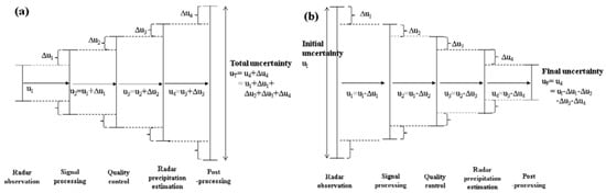 In a radar-based precipitation estimation process, all stages must be considered consecutively and assessed in a comprehensive manner because the results of a previous stage inevitably affect the initial conditions of subsequent stages. Consequently, the final outcome in assessment and quantification of uncertainty should be presented as shown in Figure 1a. In contrast, uncertainty will occur largely in the radar measurement stage and this uncertainty is expected to be reduced during signal processing, quality control, precipitation estimation, and post-processing, as in Figure 1b. Therefore, this study proposed the uncertainty propagation in radar-based precipitation estimation shown in Figure 1, and analyzed the total uncertainty and its propagation.