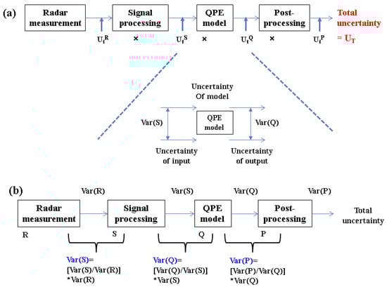 Basic concept of uncertainty Delta method (UDM): (a) uncertainty quantification and propagation in the precipitation estimation process, (b) quantification in each stage. QPE: quantitative precipitation estimation.