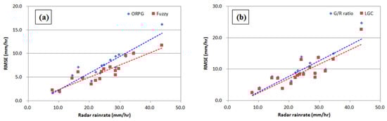 As described in Section 3.1, eight ensemble radar-based precipitation estimates were calculated using two quality control algorithms, two precipitation estimation methods, and two post-processing precipitation bias correction methods for the entire Korean peninsula. Following the quality control methods (ORPG and fuzzy algorithms) and the post-processing precipitation bias correction methods (G/R ratio and LGC methods), the accuracy of the radar-based precipitation estimates was compared with the observed precipitation reported by the AWSs (see Table 2). It can be seen from Table 2a that the values of root mean square error (RMSE) and correlation coefficient (CC) relating to the ORPG method were 8.56 mm/h and 0.79, respectively, while those relating to the fuzzy method were 8.32 mm/h and 0.81, respectively. Thus, the accuracy of radar-based precipitation estimates produced using the fuzzy algorithm was superior to that produced using the ORPG method. Table 2b shows the results of the precipitation estimates obtained by applying the G/R ratio and LGC methods to all 18 precipitation events (18 precipitation events × 2 quality control methods). The RMSE and CC values of the G/R ratio method were 7.29 mm/h and 0.93, respectively, while those of the LGC method were 6.06 mm/h and 0.94, respectively. Thus, the accuracy of radar-based precipitation estimates produced using the LGC method, which corrected the bias of the precipitation estimates at each radar pixel, was superior to that produced using the G/R ratio method. Figure 3 shows Q-Q (quantile-quantile) plots of the RMSEs of the radar-based precipitation estimates in each quality control algorithm and bias correction method for the 18 precipitation cases. It can be seen that the RMSEs of the fuzzy algorithm and the LGC method were superior for each precipitation case.