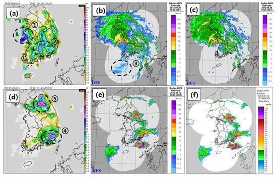 Illustrated in Figure 4d–f are the AWS-observed precipitation and the radar-based precipitation estimates produced by applying the G/R ratio and LGC algorithms, respectively, for case 6, which was a case of Changma that formed along the east sea coast to the southern sea at 05:30 LST on 13 July 2012. The precipitation observed by the AWSs (Figure 4d) shows very intense precipitation in regions ④ and ⑤; the most intense precipitation was 53.5 mm/h in region ⑤. Precipitation estimates produced by applying the G/R ratio method (Figure 4e) were underestimated considerably throughout the entire area. In contrast, in Figure 4f, precipitation estimates produced by applying the LGC method were more intense than those produced using the G/R ratio method; especially, in relation to the occurrence of the intense precipitation in regions ④ and ⑤ that was relatively well estimated.