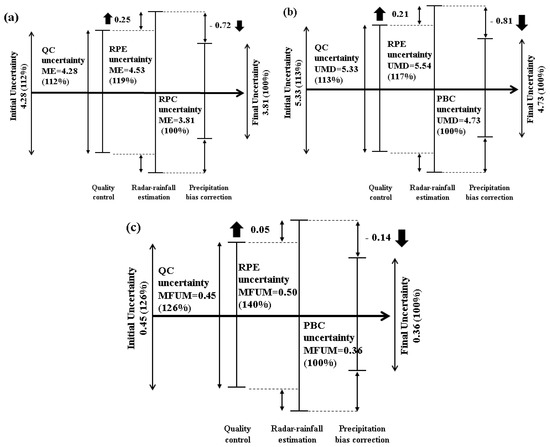 In applying the UDM, the variances of each stage were calculated. Those of the ORPG and fuzzy algorithms in quality control were 206.43 and 121.51 mm2/h2, respectively, those of the WPMM and M–P relations were 145.47 and 254.68 mm2/h2, respectively, and those of the LGC and G/R ratio methods were calculated as 82.45 and 115.58 mm2/h2, respectively. Table 3b and Figure 5b show that the UDM values of the ORPG and fuzzy algorithms in quality control were 5.33 and 4.80, respectively, the UDM values of the WPMM and M–P relations in precipitation estimation were 0.18 and 0.21, respectively and the UDM values of the LGC method and G/R ratio method in post-processing were −0.79 and −0.81, respectively. In considering uncertainty in the UDM, the initial uncertainty was 5.33 (same as the UDM value of quality control) and the final uncertainty was estimated to be 4.75, which was the same as that of the post-processing stage. Assuming that the UDM value of the final uncertainty was 100%, the UDM value of the quality control stage was 113% and that of the radar-based precipitation estimation stage was 117%. This result shows that, similar to the tendency of ME, uncertainty decreased in the post-processing stage in the radar-based precipitation estimation, although it increased in comparison with the initial uncertainty. The final uncertainty also decreased compared to the initial uncertainty. It can be determined that the M–P relation was the major contributor to the increasing uncertainty in the precipitation estimation stage, because the UDM value of the M–P relation was larger than that of the WPMM.