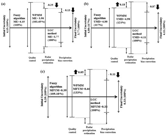Table 3c and Figure 5c show that the M-FUM values of the ORPG and fuzzy algorithms in quality control were 0.45 and 0.39, respectively, the M-FUM values of the WPMM and M–P relations in precipitation estimation were estimated at 0.44 and 0.50, respectively, and the M-FUM values of the LGC and G/R ratio methods in the post-processing were 0.33 and 0.36, respectively. Although the final uncertainty (0.36) was smaller than the initial uncertainty (=0.45), the uncertainty in the middle stage of the entire process increased in comparison with the initial uncertainty. Assuming that the final uncertainty was 100%, as in the previous methods, the uncertainties of the quality control stage and the radar-based precipitation estimation stage were 126% and 140%, respectively. Hence, although the uncertainty of the subsequent stage increased in comparison with the initial uncertainty, the uncertainty then decreased in the post-processing stage. This change in uncertainty was identical to that of the MEM and UDM.