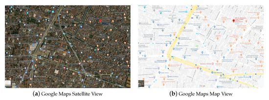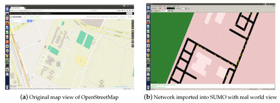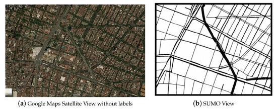 SUMO is a traffic simulatorthat has been free since 2001. Its main feature is the modeling of traffic systems, specifically road vehicles, public transport, and pedestrians. SUMO has a large number of support tools that are responsible for finding transport routes, vehicle traffic visualization, and calculation of pollutant emissions. One of the main advantages of the software being open source is that it offers the opportunity to implement any algorithm to determine the programming of the traffic lights. SUMO is not software only for traffic simulation, it also offers tools that allow analyzing the performance of the programming implemented in the road network. As an essential part for the simulation of SUMO, it is necessary to represent the road network through the “netgen” application, where each of the network crossings is defined. On the other hand, it is possible to import a map of a road network that is digital from an original map view (see Figure 1a) and the SUMO network (see Figure 1b).