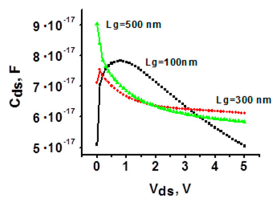 As expected, embedding a charge into the gate oxide layer led to a change in the effective capacitance of the drain–substrate and source–substrate lateral junctions in the corresponding C–V dependencies of these junctions at low voltages. The effective capacitance of the aforementioned junctions means that the C–V dependence of the lateral junctions is not similar to the C–V dependence of a separate p–n junction (Figure 2). This is obviously the result of the significant impact of other MOSFET junctions at small sizes. For comparison, the C–V dependency of the drain–substrate junctions was simulated for different gate lengths (Figure 2). For a gate length of more than 300 nm, the C–V dependence of the drain–substrate junction was similar to the C–V dependency of a separate p–n junction. At shorter gate lengths, the capacitances of lateral junctions correspond to the effective capacitances. Therefore, in our case with a gate length of 100 nm, we have taken into account the effect of the local oxide charge on the effective lateral capacitance.