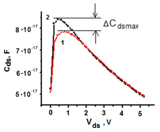After reaching the end of the gate oxide, the local charge covered all the gate oxide, and consequently the capacitances of both side junctions were under the same conditions. Overall, Figure 5 shows the dependence of the amplitude of changes in capacitances (ΔCdsmax and ΔCssmax) on the linear size (d) of the embedded local oxide charge. As clearly depicted in Figure 5, the capacitances ΔCdsmax and ΔCssmax at d = 100 nm were equal. Such behavior of the lateral capacitances eases the estimation of the linear size of the embedded oxide charge. The aforementioned dependence of the capacitances on the linear size had a peak (see the top point in Figure 5) that corresponds to the expansion of the charged area towards the middle of the oxide layer along the channel. This peak is a very important critical point that can appropriately be used for the calibration of the dependence and to accurately estimate the size of the charged area. The linearity of the dependence in the first half of the entire range of d makes it easier to estimate the linear magnitude of the injected charge. Experimentally, by simply measuring the difference of the lateral capacitances, one can quickly estimate the dynamics of the injection of hot charge carriers into the oxide layer and/or the oxide–semiconductor interface that take place during operation of the MOSFET.