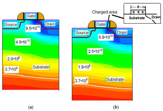 The same expression (see Equation (3)) can be written for the capacitance of the source–substrate junction. It is obvious that the trapped charge mainly influences the capacitance associated with the side wall of the junction in contact with the channel Cswc. The latter, in the flat capacitor approach, can be expressed by Cswc = εε0S/W, where εε0 is the dielectric constant of the substrate, and S and W are the area and the width of the depletion region of the junction, respectively. The curvature of the border of the depletion layer significantly affects the ratio S/W and therefore leads to changes in Cswc and Cds. At low voltages, the curvature of the considered border was considerable compared/relative to the border of other parts of the lateral junction (e.g., the part of the side wall not in contact with the channel and the bottom wall part) than at high voltages. This is clearly depicted in the C–V dependence in Figure 3 through a significant change of the capacitance at low voltages. Figure 4 shows a map of the distribution of minority charge carriers in the substrate for two cases: (a) the case considering the non-embedding of a local charge into the gate oxide and (b) the case considering the embedding of a local charge. This distribution is appropriate to the applied voltage Vds = 0.5 V, which corresponds to the range of the maximum variation of the lateral capacitances in the C–V dependence. The distribution patterns (in Figure 4) reveal that, in the case where a local oxide charge was embedded, the effective width of the depletion layer (the width of the transition region with an electron concentration exceeding 5 × 1015 cm−3) was narrower than in the case where no local oxide charge was embedded. Consequently, in case a local oxide charge was embedded, the capacitance was higher at the aforementioned specific value of the applied voltage (Vds = 0.5 V). This is clearly depicted in the C–V dependence of the lateral transitions in Figure 3. At high applied voltages, the distribution of the charge carriers in the substrate did not practically differ in the cases mentioned above, as it is shown in Figure 3 (see the range of variation of the applied voltages in which the C–V dependency coincides in Figure 3).