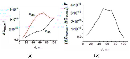 The amplitude of changes in capacitances ΔCdsmax and ΔCssmax depends on the linear size (d) of the embedded local oxide charge (Figure 5). As can be seen from Figure 5, ΔCdsmax increased linearly with increasing d. In contrast, after crossing the center/middle of the oxide along the channel, the capacitance ΔCdsmax reached saturation (see top point in the red curve in Figure 5) and afterwards decreased with a further increase in d. This reveals the weakening of the influence of the local oxide charge on the redistribution of charge carriers in the vicinity of the drain when increasing the distance up to source. As it appears in Figure 5, the capacitance ΔCssmax also rose linearly with increasing d. This evolution reached saturation after passing through the middle of the oxide and kept increasing (at a significantly high rate) with a further increase in d. This reveals the increased effect of the local oxide charge on the redistribution of charge carriers in the vicinity of the source as the distance from the source decreases.
