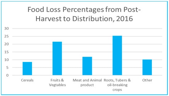 Food waste occurs along different stages in the supply chain, starting with on farm waste as a result of inadequate harvesting and handling, to losses through processing and storage, then in transportation and distribution due to the use of unsuitable facilities, and losses at the retail shops due to limited shelf-life or improper storing. Figure 1 shows percentages of food losses for different categories, from post-harvest to distribution. Fruits and vegetables are considered a major contributor after the roots, tubers, and oil-breaking corps to food wastage along the supply chain with 21.6% []. Apart from the ethical side of wasting food, other problems such as food contamination is an issue of concern. Many deaths over the years were linked to presence of pathogens in packaged food []. The economic loss and the environmental depletion of agricultural resources are also major problems that need to be addressed. All of that brought to attention the necessity to take the appropriate measures to ensure control and reduction in these wastage rates. Smart packaging presents a viable solution in such application to reduce the inefficiencies and wastage in the food supply chain [].