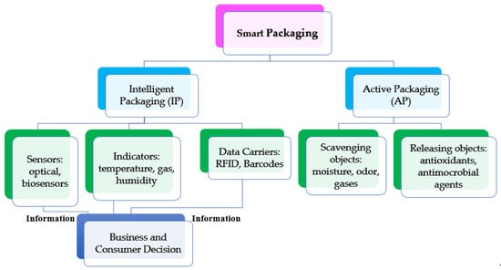 In the last two decades smart packaging has become popular especially because it leads the consumer and businesses to make better decisions regarding food quality. It can be further classified into two main categories: intelligent packaging (IP) to monitor the freshness and safety, and active packaging (AP) to keep or improve the quality. IP is defined as one of the packaging systems that plays an important role by providing means of sensing/indicating and communicating the information about the freshness and the safety of the consumed vegetables and aims to prolong the shelf life. This emerging packaging technology, that serves as a barrier against environmental influences such as odors, dust, micro-organisms, facilitates decision making regarding the quality of the packaged food. IP contains smart devices that are capable of tracing and monitoring the freshness of the produce. It can also store and transfer the sensed information to retailers and stakeholders to improve the technology. Intelligent packaging (IP) can be classified into three main categories: sensors, indicators, and data carrier, as shown in Figure 2. Each category can be either placed inside or on the package to provide information about each package, or to monitor the environment surrounding the packages [,]. In contrast, active packaging (AP) is defined as the system that incorporates active components such as scavenging or releasing objects in response to changes in package headspace to extend the shelf-life of the packaged food. AP can be further classified depending on the objects used inside the package into scavengers and releasers. Scavenging objects concern the capture of excess moisture, odors, and gases such as moisture absorbers, oxygen scavengers, and odor absorbers []. The releasing objects are usually emitters/generators that release objects such as antimicrobials agents, carbon dioxide emitters, and antioxidants [].
