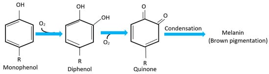 The appropriate amount of oxygen inside the package is chosen depending on the type of vegetables. Oxidation is considered an important factor that can affect their shelf life. For example, the oxidation process induces the browning in vegetables by the action of polyphenol oxidase (PPO) []. PPO is a coper-containing metalloprotein enzyme that becomes exposed to air in fresh cut vegetables catalyzes the oxidation of phenolic compounds producing quinone, then further reaction with other amino acids produces brown pigment colors (Melanin) on exposed chloroplasts [,,]. The summarized reaction is shown in Figure 3. Therefore, inhibiting this oxidation process requires adjustment of the oxygen partial pressure inside the package. For instance, for lettuce it was found that keeping the oxygen in the range of 0–1 kPa will reduce this process significantly. The problem of oxidation does not only lie in the brown color that might affect customers’ desire to buy, but also leads to loss of the nutritional value of vegetables due to destruction of many nutrients such as vitamins and proteins. Moreover, the flavor may also change with this process, thus the quality deteriorates [].