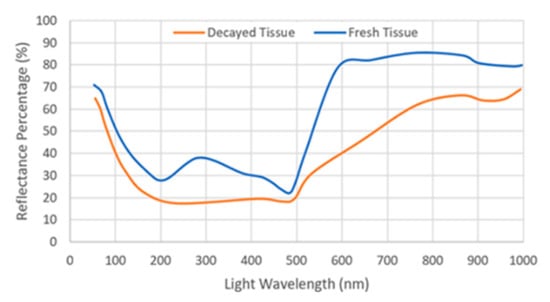 Reflectance for fresh and decayed tissue versus wavelengths. (Regenerated with permission from Postharvest Biology and Technology journal []).