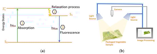 At present, chlorophyll fluorescence imaging use fluorometers to measure the amount of emitted light after excitations of Chl with light at certain wavelengths. Illuminating the leaves will give a photon of energy, h, to Chl pigments. This will lead to creation of excited unstable state (S1’), that has a very short half-life in the order of nanoseconds []. Therefore, through the relaxation process, light will be emitted as shown in Jablonski diagram in Figure 5a. The wavelength of the emitted light depends on the energy difference in the two states. Chl pigments are classified into Chl-a and Chl-b. Chl-a was found to be a good fluorescent material, hence fluorescence is measured based on the excitation of Chl-a. Chl-a has two absorption peaks, one at 430 nm (blue light) and the other at 665 nm (red light) with higher absorption at the blue light [,]. For emission, Chl-a emits in the red-light region at 680 nm (higher) and 750 nm [,]. This means that for better resolution, a fluorometer will excite at 430 nm and measure fluorescence at 680 nm. However, due to the decomposition of Chl-a at 430 nm into by-products such as pheophytin, 460 nm light is used for excitation of Chl-a [,]. The connection between the fluorescence intensity and Chl is based on Beer–Lamberts law of absorption [,]. Although the quantum efficiency of Chl is low and in the range of 2% to 10% of the absorbed light [], it is still a very useful and powerful technique for plant physiologists in studying Chl fluorescence effect in vegetation [,,].