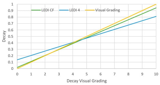 Decay detection of lettuce with LEDI4 and LEDICF versus visual rating, the black line represents the theoretical perfect match. (reproduced with permission from Postharvest Biology and Technology journal []).