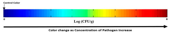 For more convenient interpretation, a prediction map is constructed to give a visual indication based on the fingerprint left by the E. coli count on the leaves of each pixel in the spatial plane of the hyperspectral image based on the chemometric techniques. This map shows visual color changes as the count increase, which allows for an easy, rapid, and accurate detection. The blue color is considered the control and as the concentration of E. coli on the leaves increase, color shift towards green, yellow, orange, and then red []. This allows for easier detection of the contaminated samples with visual colors as shown in Figure 7. This simple method shows the high possibility of using such a technique for the detection of pathogens. Testing of this technology is done only on certain strain of E. coli (K12); hence, more tests are needed to validate and ensure its compatibility to detect other strains of E. coli or even other pathogens.