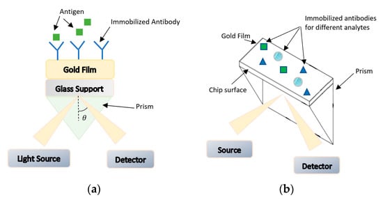 The use of optical systems as a part of biosensors has been extensively investigated. These biosensors use light-based interactions to measure the biochemical reactions. One of the common methods for freshness detection of foodborne pathogens is surface plasmon resonance (SPR) []. This opto-electronic phenomenon is based on the energy transfer to electrons in a metal surface as from visible or near infrared monochromatic light through a prism into surface plasmon resonance to be detected by photodiodes. The photon energy transferred to electrons will free them and lead to the generation of electromagnetic waves (surface plasmons) that resonate and absorb light; thus, the reflectivity will be minimum at this specific angle []. This angle is a function of refractive index which depends on the mass of immobilized antibodies. The reflected beam will shift to longer wavelength due to the biomolecular interaction changing the refractive index []. Hence, measuring this change will qualitatively detect the presence of these analytes without the need for enriching and culturing. Figure 9a summarizes the working principle of this biosensor. The advantages of this SPR technology are their high sensitivity and selectivity and they can be made in the form of compact chips. On the other hand, the use of prism is not always suitable for chip-based sensors. Moreover, there is a limit in the number of simultaneous measurements that can be performed. To overcome these issues, the use of multiple channels sensors was proposed to allow for parallel measurements. SPR imaging biochips were used to measure change in refractive index, in order to reduce non-specific signals from background [,].