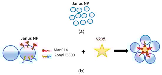 (a) Optical top view for Janus droplets shows their transparency. (b) Part of Janus partials forming carbohydrate-based interactions is capable of binding to ConA which is like antigens of E. Coli. (c) Binding with ConA shows how Janus droplets cluster causing optical changes.