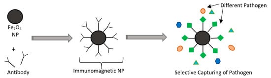 NP-based microbial sensors can be used instead of conventional biosensors. Incorporation of other materials such as silver nanoparticles (AgNPs), and gold nanoparticles (AuNPs) was noticed to interact with proteins of pathogens such as E. coli preventing their DNA replication [,,,]. The advantages of using NPs in sensors are in their unique optical and electrical properties that improve the sensitivity, response time, and selectivity compared to biological sensors. NPs can also act like a “magnet” to capture specific pathogens, and such systems are known as immunomagnetic separation-based (IMS-based) detection []. Magnetic nanoparticles such as (Fe2O3) can bind to specific antibodies that can be used to identify pathogens. This will allow for detection due to observable electrical and optical changes after binding and for isolating pathogens by applying an external electric field [,]. The working principles of IMS are shown in Figure 12. However, the use of these nanoparticles is still being studied as there are concerns about the possibility of their migration to food inside the package. The validation process of such sensors should be carefully studied, as issues regarding the safety and hazards must be addressed to ensure public health safety.