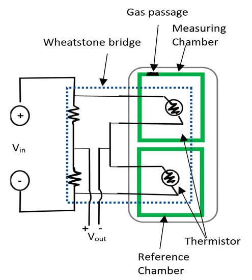 Another type of sensing is based on thermal resistors whose resistance changes according to the thermal conductivity of carbon dioxide passing through it. The thermal resistors are two arms of a Wheatstone bridge that is shown in Figure 13. This type relies on the variation of the conductivity with the concentration of carbon dioxide, but it is also affected by temperature and humidity. The idea here is to measure the resistance of the thermal resistor in the CO2 atmosphere by comparing its value to an identical thermistor in a reference chamber with sealed atmosphere under same temperature and humidity conditions. An increase in the concertation of the gas causes the molecular weight to be heavier compared to the dry air, shifting the output to positive, and the opposite occurs when there is less carbon dioxide in the air. The linear response of this sensor made it very suitable for gas detection up to 100% [,]. However, the drawback of this type is in the dependence on other factors such as humidity and temperature that makes the sensor reading unreliable unless these conditions are the same and constant in both chambers [,]. Many other carbon dioxide sensors were developed based on other techniques such as emulsions of iconic liquids at room temperature [], and the polymer hydrogel-based sensor []. However, an important concern with these sensors that are used to quantify carbon dioxide will be the possibility of migration of the sensor materials to the food.