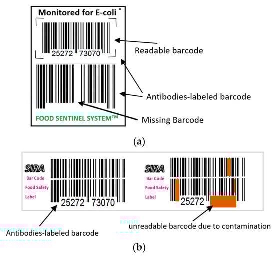 Another approach is the grating-coupled SPR imaging that uses optical diffraction gratings for coupling and providing angle readings, and it is a low cost and wide dynamic range imaging [,,,]. In [], an SPR-based protein chip, as illustrated in Figure 9b, was used for the detection of E. coli O157:H7, Salmonella, and other pathogens. This means that there is a high potential of using such a system in packaging. By integrating this chip as part of the package, the package can be screened with the use of light source and SPR spectroscopy to check if pathogens are present. Furthermore, the response of antigens binding to the immobilized antibodies on Au-substrate was enhanced with the use of G protein [,]. Other popular optical biosensors that are used for pathogens include Raman spectroscopy [,], Fourier transform infrared (FT-IR) [], and fiber optics []. However, these techniques need culturing to increase the biomass of the pathogen before detection. In addition, the difficulty in integrating these as part of the packaging where contact of food with nanoparticles (NP) is unavoidable, makes them suitable for a different stage of supply chain, for instance in pre-packaging. Other techniques developed for bacterial detection as a type of freshness indicator include those based on surface plasmon resonance (SPR) [], hyperspectral imaging [], or polymerase chain reaction [,]. However, these methods require expensive equipment that make them non-commercial for use in supermarkets for monitoring packaged vegetables.