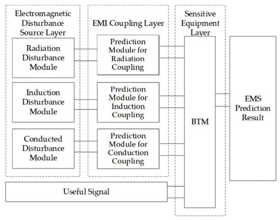 Then, all the modules are put into three layers and the whole modular system-level model is completed. The three layers are divided based on three elements of EMC, i.e., electromagnetic disturbance source, EMI coupling, and sensitive equipment layers, as shown in Figure 3.
