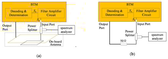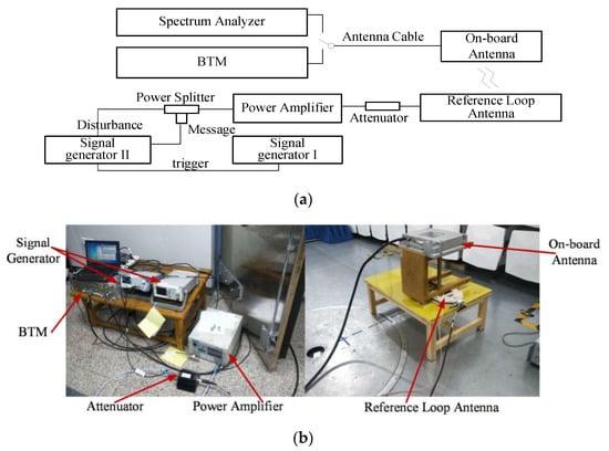 Setup to find out the main disturbance coupling path for BTM system: (a) The testing with the antenna connection; (b) The testing with 50 Ω connection.