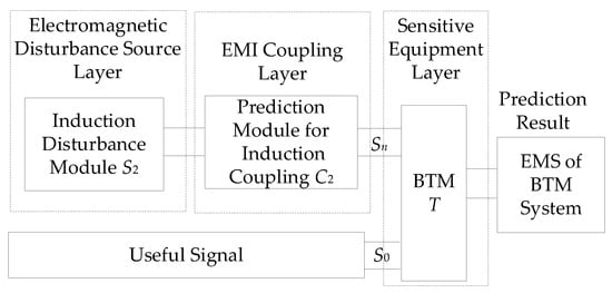 Based on the analysis above, the influence of radiation disturbance and conductive disturbance could be ignored. Thus, it is assumed that the voltages of Sr1 and Sr3 in Figure 4 equal to zero. The modules for radiation and conducted disturbance could be ignored. For modular system-level modeling method in the paper, the module could be utilized alone according to requirements for practical problems. Thus, the BTM EMS prediction model could be simplified as induction disturbance, induction coupling, and sensitive equipment modules, as shown in Figure 8.