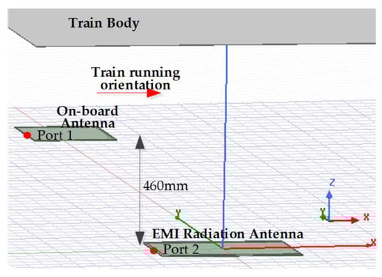 The size of EMI radiation antenna and the voltage of the induction disturbance S2 are considered as the output of induction disturbance source module. They perform as the input of the inductive coupling module. The size of the rectangular loop antenna is 240 × 430 mm. In addition, the size of the on-board antenna is 240 × 265 mm. Port 1 on the on-board antenna is the antenna receiving port, while the Port 2 on the EMI radiation antenna is disturbance transmitting port. The vertical distance of the two antennas is 460 mm based on the height from on-board antenna to the rail.
