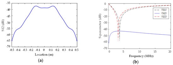 Set the center of the EMI radiation antenna to be at the ordinate origin. Train running orientation is the positive direction along Y-axis. The S-parameters of antennas shown in Figure 11a is the S12 as different horizontal distances between two antennas’ centers. The value of S12 keeps stable within the scope of ±0.2 m. Thus, S-parameter of the antenna system is used when on-board antenna is located right above the EMI radiation antenna.